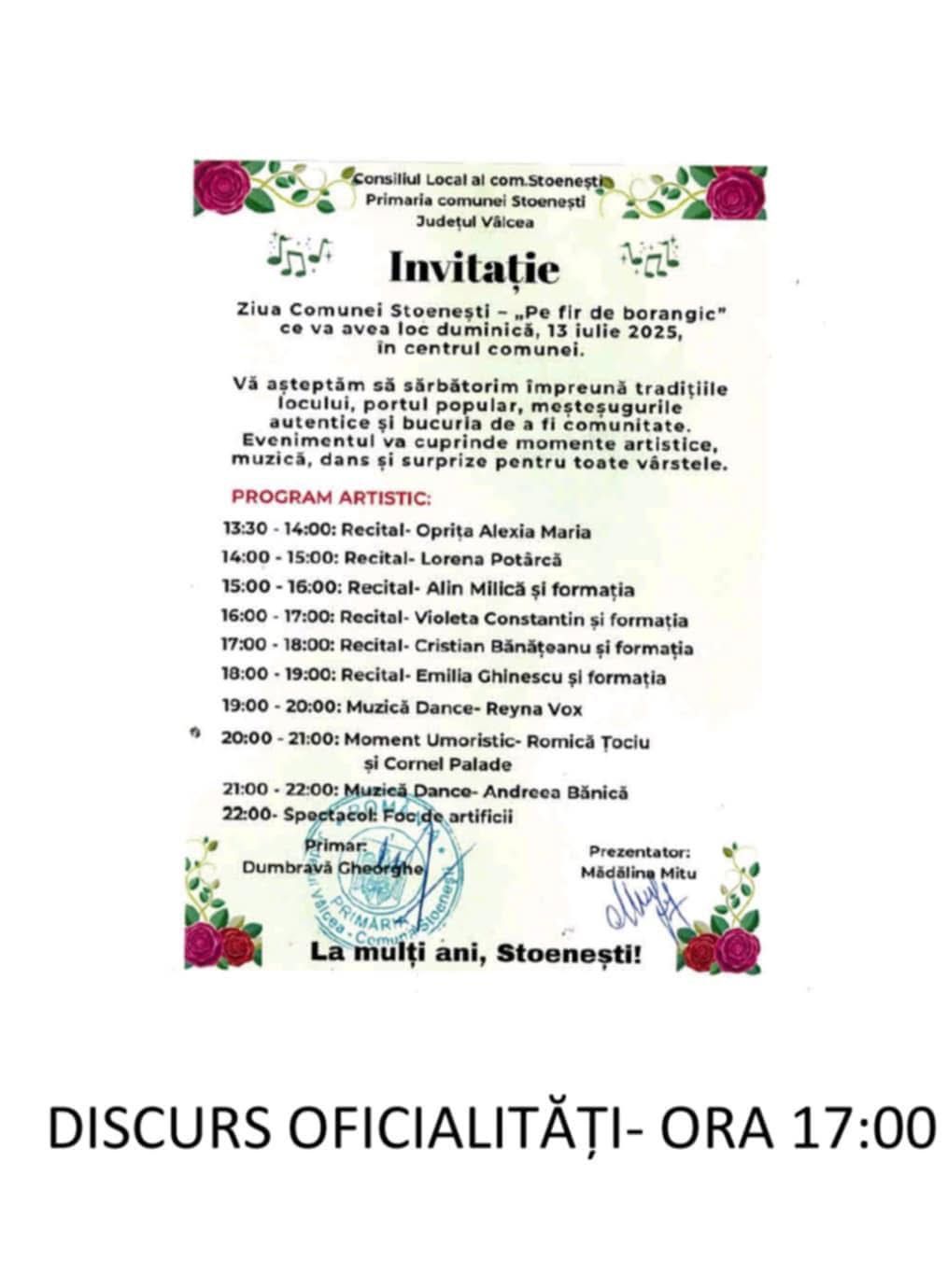 Iar seara se va încheia spectaculos, cu un foc de artificii care va lumina cerul Stoeneștiului, marcând finalul unei zile de neuitat.