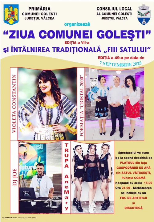 Pe 7 septembrie, comuna Golești își primește fiii acasă pentru una dintre cele mai frumoase sărbători ale toamnei: Ziua Comunei Golești. Evenimentul, aflat la a 49-a ediție, este organizat de Primăria și Consiliul Local Golești, sub coordonarea primarului Adrian Mitrache, și aduce laolaltă tradiția, folclorul autentic și muzica de calitate.